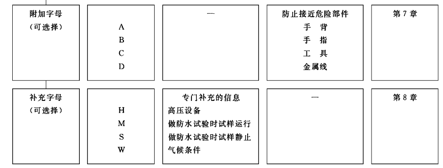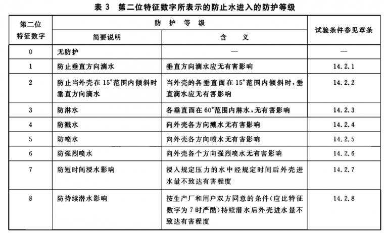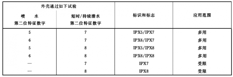 防護等級的細節,特別是第二位特征數字為5/6(噴水)和7/8(潛水)見第6 章。