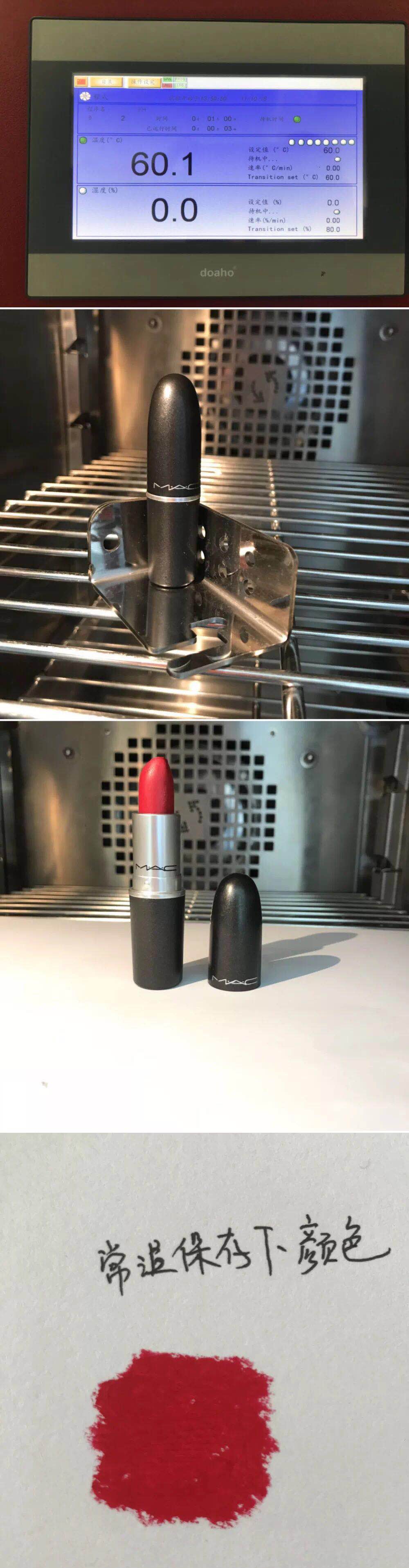 測試方法:按照圖片順序閱讀,首先將高大上的高低溫試驗箱溫度設定值設為60℃,觀察下口紅的顏色與形狀,然后點擊設備開始運行,時間為一小時。